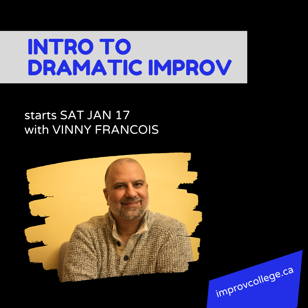 The left two-thirds is composed of the class title "Intro to Dramatic Improv" in blue on a yellow rectangle above an image of Vinny against a black background, with improvcollege.ca on tilted blue parallelogram in lower right.